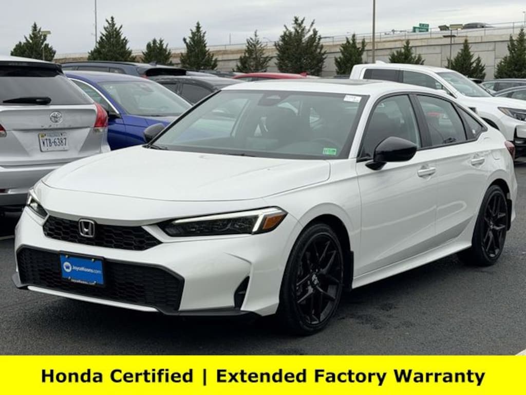 CARFAX One-Owner. Clean CARFAX. Certified. Platinum White Pearl 2025 Honda Civic Hybrid Sport ***ONE OWNER***, ***LOW MILES***, ***DEALER MAINTAINED***, ***EXCELLENT CONDITION***, ***HONDA CERTIFIED***, ***ADAPTIVE CRUISE CONTROL***, ***ALLOY WHEELS***, ***BACK UP CAMERA***, ***BLIND SIDE MONITORING***, ***FORWARD COLLISION ALERT***, ***LANE DEPARTURE WARNING***, ***HEATED SEATS***, ***POWER MOONROOF***, ***REMOTE START***, HondaTrue Certified Certified, 2.0L 16V DOHC, 4-Wheel Disc Brakes, 8 Speakers, ABS brakes, Adaptive Cruise Control: Adaptive Cruise Control (ACC) with Low-Speed Follow, Air Conditioning, Alloy wheels, AM/FM radio, Apple CarPlay/Android Auto, Auto High-beam Headlights, Automatic temperature control, Blind Spot Information (BSI) System warning, Brake assist, Bumpers: body-color, Cloth/Leatherette Seat Trim, Delay-off headlights, Driver door bin, Driver vanity mirror, Dual front impact airbags, Dual front side impact airbags, Electronic Stability Control, Emergency communication system: HondaLink, Exterior Parking Camera Rear, Four wheel independent suspension, Front anti-roll bar, Front Bucket Seats, Front Center Armrest, Front dual zone A/C, Front reading lights, Fully automatic headlights, Heated door mirrors, Heated Front Bucket Seats, Heated front seats, Illuminated entry, Knee airbag, Leather Shift Knob, Leather steering wheel, Low tire pressure warning, Occupant sensing airbag, Outside temperature display, Overhead airbag, Panic alarm, Passenger door bin, Passenger vanity mirror, Power door mirrors, Power moonroof, Power steering, Power windows, Radio data system, Radio: 180-Watt Audio System, Rear anti-roll bar, Rear seat center armrest, Rear side impact airbag, Rear window defroster, Remote keyless entry, Security system, Speed control, Speed-sensing steering, Split folding rear seat, Steering wheel mounted audio controls, Tachometer, Telescoping steering wheel, Tilt steering wheel, Traction control, Trip computer, Variably intermittent wipers, Wheels: 18" Gloss Black Alloy, 2.0L 16V DOHC.