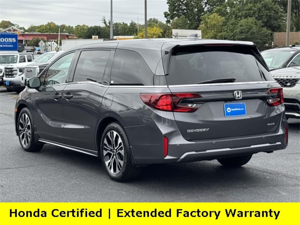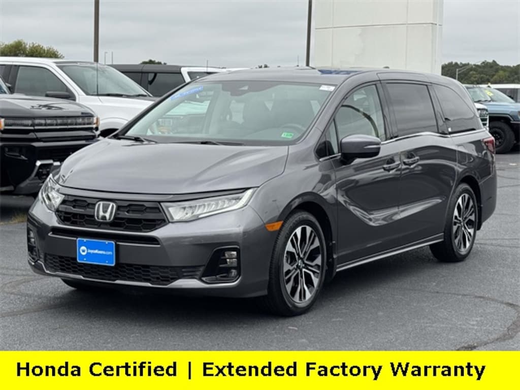 CARFAX One-Owner. Clean CARFAX. Certified. Modern Steel Metallic 2025 Honda Odyssey Elite ***ONE OWNER***, ***LOW MILES***, ***DEALER MAINTAINED***, ***EXCELLENT CONDITION***, ***LOADED***, ***HONDA CERTIFIED***, ***3RD ROW SEATS***, ***ADAPTIVE CRUISE CONTROL***, ***ALLOY WHEELS***, ***BACK UP CAMERA***, ***COOLED SEATS***, ***DUAL POWER SLIDING DOORS***, ***BLIND SIDE MONITORING***, ***FORWARD COLLISION ALERT***, ***LANE DEPARTURE WARNING***, ***HEATED SEATS***, ***HEATED STEERING WHEEL***, ***LEATHER***, ***SIRIUS XM RADIO***, ***NAVIGATION***, ***POWER LIFTGATE***, ***POWER MOONROOF***, ***POWER SEATS***, ***REAR ENTERTAINMENT***, ***REMOTE START***, HondaTrue Certified Certified, 11 Speakers, 3rd row seats: split-bench, 4-Wheel Disc Brakes, ABS brakes, Adaptive Cruise Control: Adaptive Cruise Control (ACC) with Low-Speed Follow, Air Conditioning, Alloy wheels, AM/FM radio: SiriusXM, Anti-whiplash front head restraints, Apple CarPlay/Android Auto, Auto High-beam Headlights, Auto-dimming door mirrors, Auto-dimming Rear-View mirror, Automatic temperature control, Blind Spot Information (BSI) System warning, Brake assist, Bumpers: body-color, Compass, Delay-off headlights, Driver door bin, Driver vanity mirror, Driver's Seat Mounted Armrest, Dual front impact airbags, Dual front side impact airbags, Electronic Stability Control, Emergency communication system: HondaLink, Exterior Parking Camera Rear, Four wheel independent suspension, Front anti-roll bar, Front Bucket Seats, Front dual zone A/C, Front fog lights, Front reading lights, Fully automatic headlights, Garage door transmitter: HomeLink, Heated & Ventilated Front Bucket Seats, Heated door mirrors, Heated front seats, Heated steering wheel, Illuminated entry, Knee airbag, Lane departure: Lane Keeping Assist System (LKAS) active, Leather steering wheel, Low tire pressure warning, Memory seat, Navigation system: Honda Satellite-Linked Navigation System, Occupant sensing airbag, Outside temperature display, Overhead airbag, Overhead console, Panic alarm, Passenger door bin, Passenger seat mounted armrest, Passenger vanity mirror, Perforated Leather Trimmed Seats w/Piping, Power door mirrors, Power driver seat, Power Liftgate, Power moonroof, Power passenger seat, Power steering, Power windows, Radio data system, Radio: 500-Watt AM/FM/HD Premium Audio System, Rain sensing wipers, Rear air conditioning, Rear anti-roll bar, Rear audio controls, Rear reading lights, Rear seat center armrest, Rear window defroster, Rear window wiper, Reclining 3rd row seat, Remote keyless entry, Security system, Speed control, Speed-sensing steering, Speed-Sensitive Wipers, Split folding rear seat, Spoiler, Steering wheel mounted audio controls, Tachometer, Telescoping steering wheel, Tilt steering wheel, Traction control, Trip computer, Turn signal indicator mirrors, Variably intermittent wipers, Ventilated front seats, Wheels: 19" Machine-Finished Alloy.