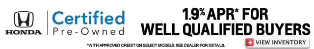 You'll have access to financing through Honda Financial Services. Also, depending on your situation, it might be to your advantage to lease your Certified Pre-Owned Honda.Complimentary SirusXM Radio for 90 days