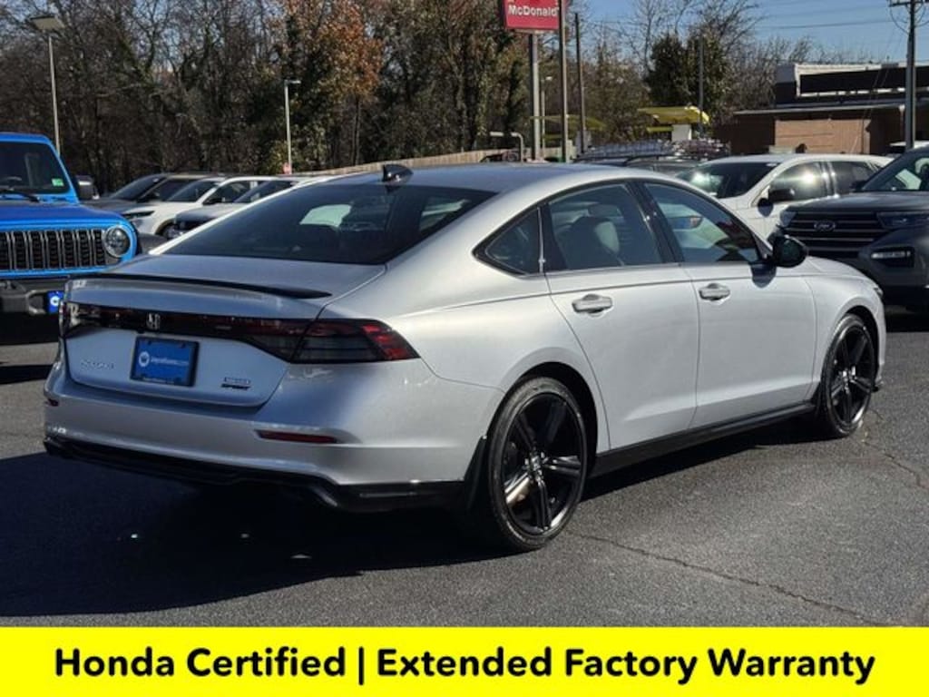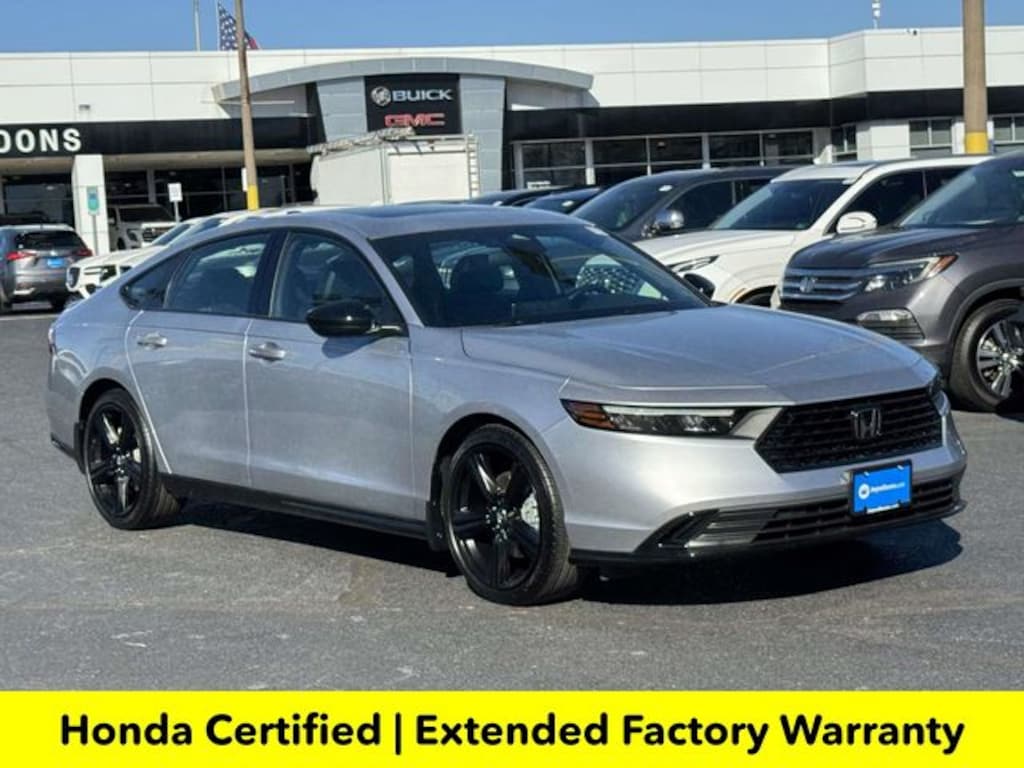 CARFAX One-Owner. Clean CARFAX. Certified. Solar Silver Metallic 2025 Honda Accord Hybrid Sport-L ***ONE OWNER***, ***LOW MILES***, ***DEALER MAINTAINED***, ***EXCELLENT CONDITION***, ***HONDA CERTIFIED***, ***ADAPTIVE CRUISE CONTROL***, ***ALLOY WHEELS***, ***BACK UP CAMERA***, ***BLIND SIDE MONITORING***, ***FORWARD COLLISION ALERT***, ***LANE DEPARTURE WARNING***, ***HEATED SEATS***, ***LEATHER***, ***POWER MOONROOF***, ***POWER SEATS***, ***REMOTE START***, HondaTrue Certified Certified, 2.0L I4 DOHC 16V, 4-Wheel Disc Brakes, 8 Speakers, ABS brakes, Adaptive Cruise Control: Adaptive Cruise Control (ACC) with Low-Speed Follow, Air Conditioning, Alloy wheels, AM/FM radio, Apple CarPlay/Android Auto, Auto High-beam Headlights, Automatic temperature control, Blind Spot Information (BSI) System warning, Brake assist, Bumpers: body-color, Compass, Delay-off headlights, Driver door bin, Driver vanity mirror, Dual front impact airbags, Dual front side impact airbags, Electronic Stability Control, Emergency communication system: HondaLink, Exterior Parking Camera Rear, Four wheel independent suspension, Front anti-roll bar, Front Bucket Seats, Front Center Armrest, Front dual zone A/C, Front reading lights, Fully automatic headlights, Heated Front Bucket Seats, Heated front seats, Illuminated entry, Knee airbag, Lane departure: Lane Keeping Assist System (LKAS) active, Leather Shift Knob, Leather steering wheel, Leather-Trimmed Seat Trim, Low tire pressure warning, Memory seat, Occupant sensing airbag, Outside temperature display, Overhead airbag, Overhead console, Panic alarm, Passenger door bin, Passenger vanity mirror, Power door mirrors, Power driver seat, Power moonroof, Power passenger seat, Power steering, Power windows, Radio data system, Radio: 180-Watt Audio System, Rear anti-roll bar, Rear reading lights, Rear seat center armrest, Rear side impact airbag, Rear window defroster, Remote keyless entry, Security system, Speed control, Speed-sensing steering, Speed-Sensitive Wipers, Split folding rear seat, Spoiler, Steering wheel mounted audio controls, Telescoping steering wheel, Tilt steering wheel, Traction control, Trip computer, Variably intermittent wipers, Wheels: 19" x 8.5J Matte Berlina Black, 2.0L I4 DOHC 16V.