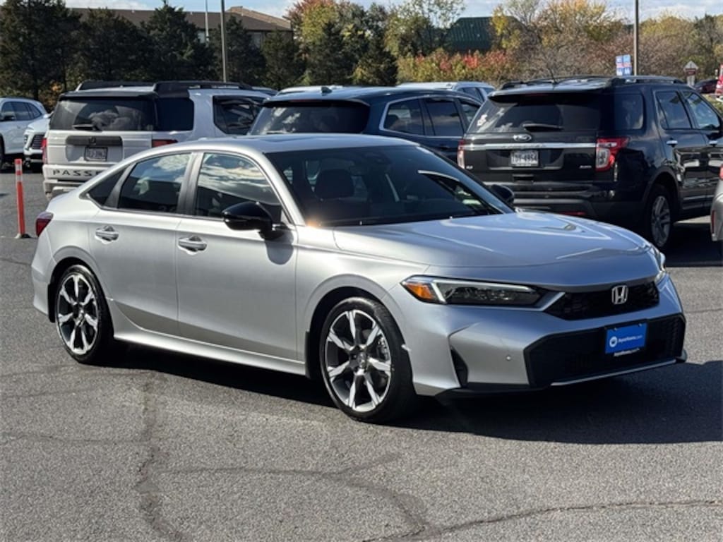 Clean CARFAX. Certified. Solar Silver Metallic 2025 Honda Civic Hybrid Sport Touring ***ONE OWNER***, ***LOW MILES***, ***DEALER MAINTAINED***, ***EXCELLENT CONDITION***, ***LOADED***, ***HONDA CERTIFIED***, ***ADAPTIVE CRUISE CONTROL***, ***ALLOY WHEELS***, ***BACK UP CAMERA***, ***BLIND SIDE MONITORING***, ***FORWARD COLLISION ALERT***, ***LANE DEPARTURE WARNING***, ***HEATED SEATS***, ***LEATHER***, ***POWER MOONROOF***, ***REMOTE START***, HondaTrue Certified Certified, 2.0L 16V DOHC, 12 Speakers, 4-Wheel Disc Brakes, ABS brakes, Adaptive Cruise Control: Adaptive Cruise Control (ACC) with Low-Speed Follow, Air Conditioning, Alloy wheels, AM/FM radio, Apple CarPlay/Android Auto, Auto High-beam Headlights, Auto-dimming Rear-View mirror, Automatic temperature control, Blind Spot Information (BSI) System warning, Bose Premium Sound System, Brake assist, Bumpers: body-color, Compass, Delay-off headlights, Driver door bin, Driver vanity mirror, Dual front impact airbags, Dual front side impact airbags, Electronic Stability Control, Emergency communication system: HondaLink, Exterior Parking Camera Rear, Four wheel independent suspension, Front anti-roll bar, Front Bucket Seats, Front Center Armrest, Front dual zone A/C, Front reading lights, Fully automatic headlights, Heated door mirrors, Heated Front Bucket Seats, Heated front seats, Illuminated entry, Knee airbag, Leather Shift Knob, Leather steering wheel, Leather-Trimmed Seat Trim, Low tire pressure warning, Navigation system: Google Maps, Occupant sensing airbag, Outside temperature display, Overhead airbag, Overhead console, Panic alarm, Passenger door bin, Passenger vanity mirror, Power door mirrors, Power driver seat, Power moonroof, Power passenger seat, Power steering, Power windows, Radio data system, Rain sensing wipers, Rear anti-roll bar, Rear seat center armrest, Rear side impact airbag, Rear window defroster, Remote keyless entry, Security system, Speed control, Speed-sensing steering, Split folding rear seat, Steering wheel mounted audio controls, Tachometer, Telescoping steering wheel, Tilt steering wheel, Traction control, Trip computer, Turn signal indicator mirrors, Variably intermittent wipers, Wheels: 18" Alloy w/Matte Shark Gray Inserts, 2.0L 16V DOHC.