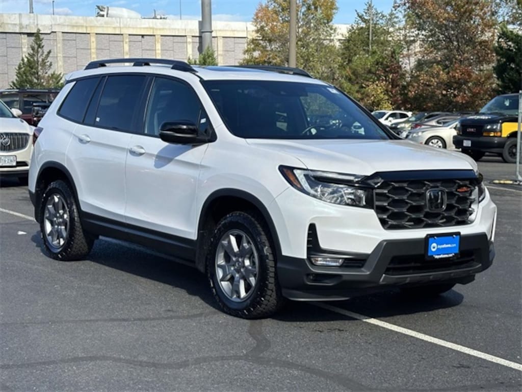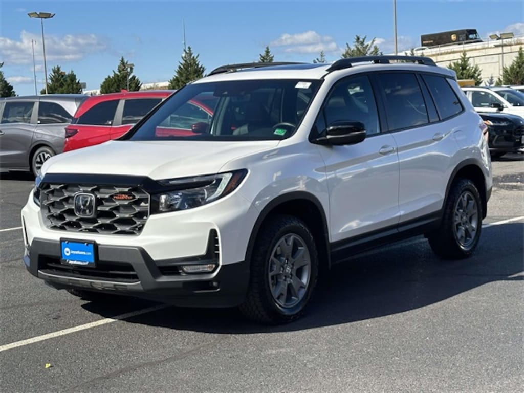 Clean CARFAX. Certified. Platinum White 2025 Honda Passport TrailSport ***ONE OWNER***, ***LOW MILES***, ***DEALER MAINTAINED***, ***EXCELLENT CONDITION***, ***LOADED***, ***HONDA CERTIFIED***, ***ALL WHEEL DRIVE***, ***ADAPTIVE CRUISE CONTROL***, ***ALLOY WHEELS***, ***BACK UP CAMERA***, ***BLIND SIDE MONITORING***, ***FORWARD COLLISION ALERT***, ***LANE DEPARTURE WARNING***, ***HEATED SEATS***, ***LEATHER***, ***NAVIGATION***, ***POWER LIFTGATE***, ***POWER MOONROOF***, ***POWER SEATS***, ***REMOTE START***, HondaTrue Certified Certified, 4-Wheel Disc Brakes, 7 Speakers, A/V remote: CabinControl, ABS brakes, Air Conditioning, Alloy wheels, AM/FM radio: SiriusXM, Apple CarPlay/Android Auto, Auto High-beam Headlights, Auto-dimming Rear-View mirror, Automatic temperature control, Blind Spot Information (BSI) System warning, Brake assist, Bumpers: body-color, Compass, Delay-off headlights, Driver door bin, Driver vanity mirror, Driver's Seat Mounted Armrest, Dual front impact airbags, Dual front side impact airbags, Electronic Stability Control, Emergency communication system: HondaLink Assist, Exterior Parking Camera Rear, Four wheel independent suspension, Front anti-roll bar, Front Bucket Seats, Front Center Armrest, Front dual zone A/C, Front fog lights, Front reading lights, Fully automatic headlights, Garage door transmitter: HomeLink, Heated door mirrors, Heated Front Bucket Seats, Heated front seats, Illuminated entry, Lane departure: Lane Keeping Assist System (LKAS) active, Leather-Trimmed Seats, Low tire pressure warning, Navigation system: Honda Satellite-Linked Navigation System, Occupant sensing airbag, Outside temperature display, Overhead airbag, Overhead console, Panic alarm, Passenger door bin, Passenger seat mounted armrest, Passenger vanity mirror, Power door mirrors, Power driver seat, Power Liftgate, Power moonroof, Power passenger seat, Power steering, Power windows, Radio data system, Radio: 215-Watt Audio System w/7 Speakers, Rear air conditioning, Rear anti-roll bar, Rear reading lights, Rear seat center armrest, Rear window defroster, Rear window wiper, Remote keyless entry, Security system, Speed control, Speed-sensing steering, Split folding rear seat, Spoiler, Steering wheel mounted audio controls, Tachometer, Telescoping steering wheel, Tilt steering wheel, Traction control, Trip computer, Turn signal indicator mirrors, Variably intermittent wipers, Wheels: 18" Pewter Gray Alloy.